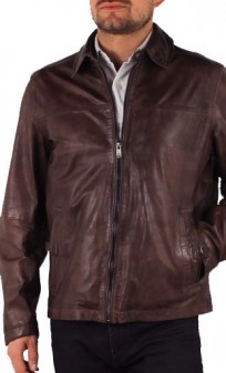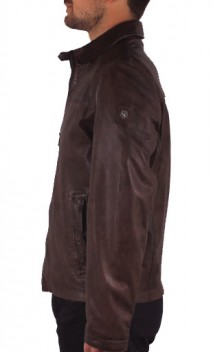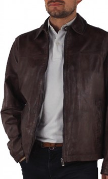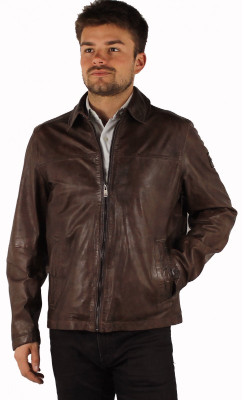 Blouson en cuir d'agneau nappa, souple, léger et doux au toucher. Coupe droite, cintrée avec un beau travail de surpiqures. Fermeture par zip central. Col chemise qui se portera également relevé avec patte cuir pressionnée à l'encolure. Manches droites. 2 poches mains latérales avec pressions. 3 poches intérieures. Doublure coton en haut du dos et polyester pour le reste.