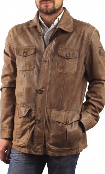 Veste de la marque MILESTONE, cuir agneau nappa dans un coloris de beige patiné, vieilli lui conférant beaucoup de relief. Très souple et légère, produit idéal pour les beaux jours. Style saharienne avec une coupe sport-chic avec col chemise montant surpiqué sur le dessous avec empiècement marron foncé. Poches poitrine boutonnées, Poches mains latérales surmontées de poches horizontales boutonnées. Fermeture par zip central avec rabat cuir boutonné. Jeux de surpiqûres qui structurent le modèle. Doublure coton avec poches intérieures.