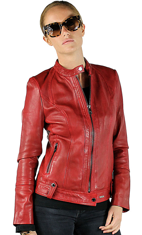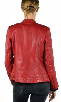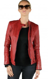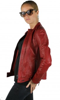 Blouson de la marque Guest, en cuir d'agneau pour obtenir le maximum de souplesse et de légèreté. Modèle d'inspiration motard avec coupe minimaliste, cintrée et chic dans un beau coloris de rouge. On craque pour le look raffiné et minimaliste de ce blouson. Facile à assortir avec toute notre garde-robe, on porte aussi bien ce blouson femme avec un jean ou une petite robe. Fermeture par zip central, col motard avec patte pressionnée, jeux de surpiqûres, poches mains latérales zippées, pattes cuir avec pressions sur la base du blouson pour la déco. Doublure polyester imprimée.