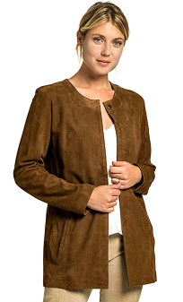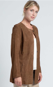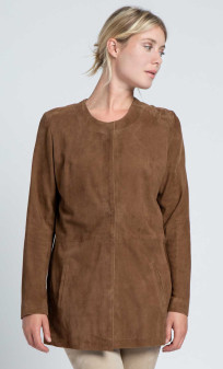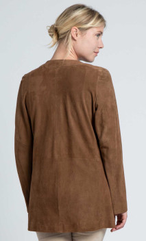 Veste longue de la marque Giorgio en chèvre velours, produit très couture et féminin, coupe droite. Modèle souple et léger, non doublé. Fermeture deux boutons aimantés, poches mains latérales.