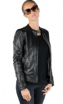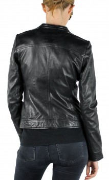 Blouson de la marque Rose Garden, en cuir d'agneau pour obtenir le maximum de souplesse et de légèreté. Modèle d'inspiration motard avec coupe minimaliste, cintrée et chic. On craque pour le look raffiné et minimaliste de ce blouson. Facile à assortir avec toute notre garde-robe, on porte aussi bien ce blouson femme avec un jean ou une petite robe. Fermeture par zip central, col motard avec patte pressionnée,  jeux de surpiqûres, poches mains latérales zippées, pattes cuir avec pressions sur la base du blouson pour la déco. Poignets zippées. Doublure polyester avec poche intérieure zippée.