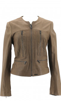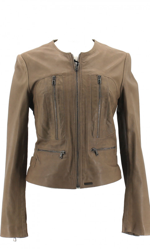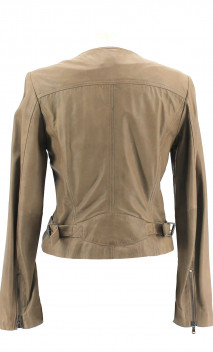 Veste femme sans col en cuir de mouton. Coupe cintrée. Coloris beige taupe. Fermeture par zip. Zips aux poignets.