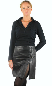 Jupe de la marque Giorgio en cuir d'agneau, fabrication française. Coupe prés du corps dont la longueur arrive mi-cuisses. Doublure polyester. Fermeture par boutons pression sur le devant.