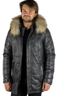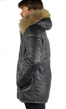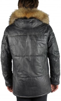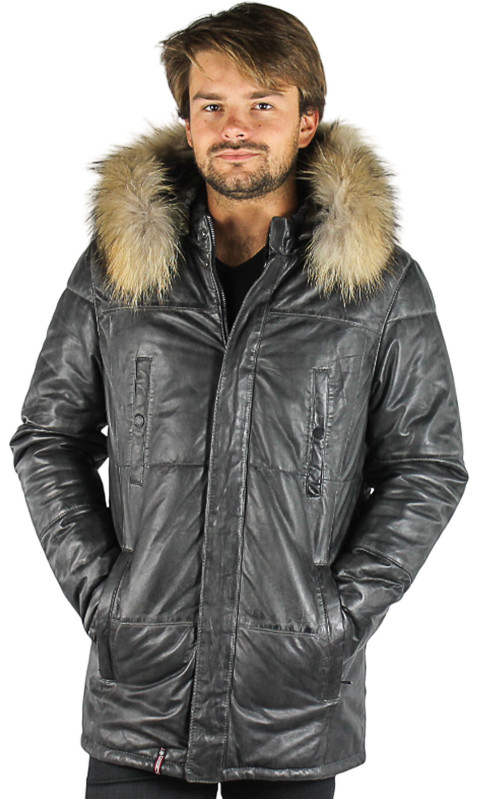 Veste de la marque Oakwood en cuir de mouton nappa, très souple et léger dans un coloris de gris patiné, vieilli. Style parka ouatinée, chaude pour affronter les rigueurs de l'hiver. Coupe cintrée, de nombreuses poches structurent le produit: poitrine, mains. Fermeture par zip central avec parement cuir pressionné se fermant jusqu'en haut du col montant.  Capuche cuir amovible intérieur imprimé camouflage comme la doublure de la parka. Capuche bordée de fourrure en finn raccoon amovible. Doublure imprimée camouflage en thinsulate: isolant mince, léger, chaud qui emprisonne et retient la chaleur du corps. 3 poches intérieures.
