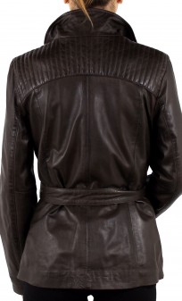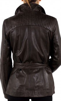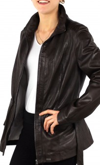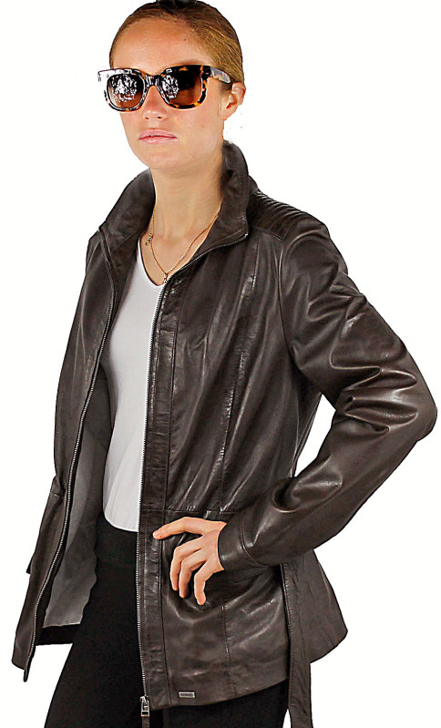 Veste de la marque GUEST, dans un cuir d'agneau très souple et léger. Coupe épurée dans un esprit saharienne. De nombreux détails structurent le modèle: jeux de surpiqûres sur les épaules et en haut du dos, fermeture par zip central jusqu'en haut du col montant, cintrage ajustable grâce à la ceinture, poches mains horizontales zippées. Produit très féminin que vous associerez avec toute votre garde-robe. Poignets pressionnés. Doublure coton et polyester.